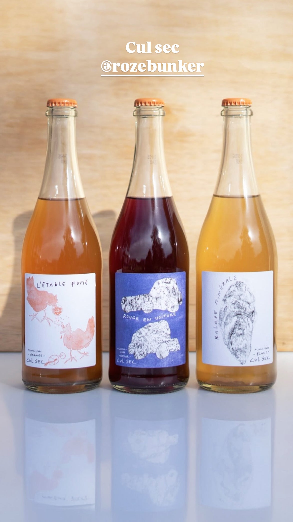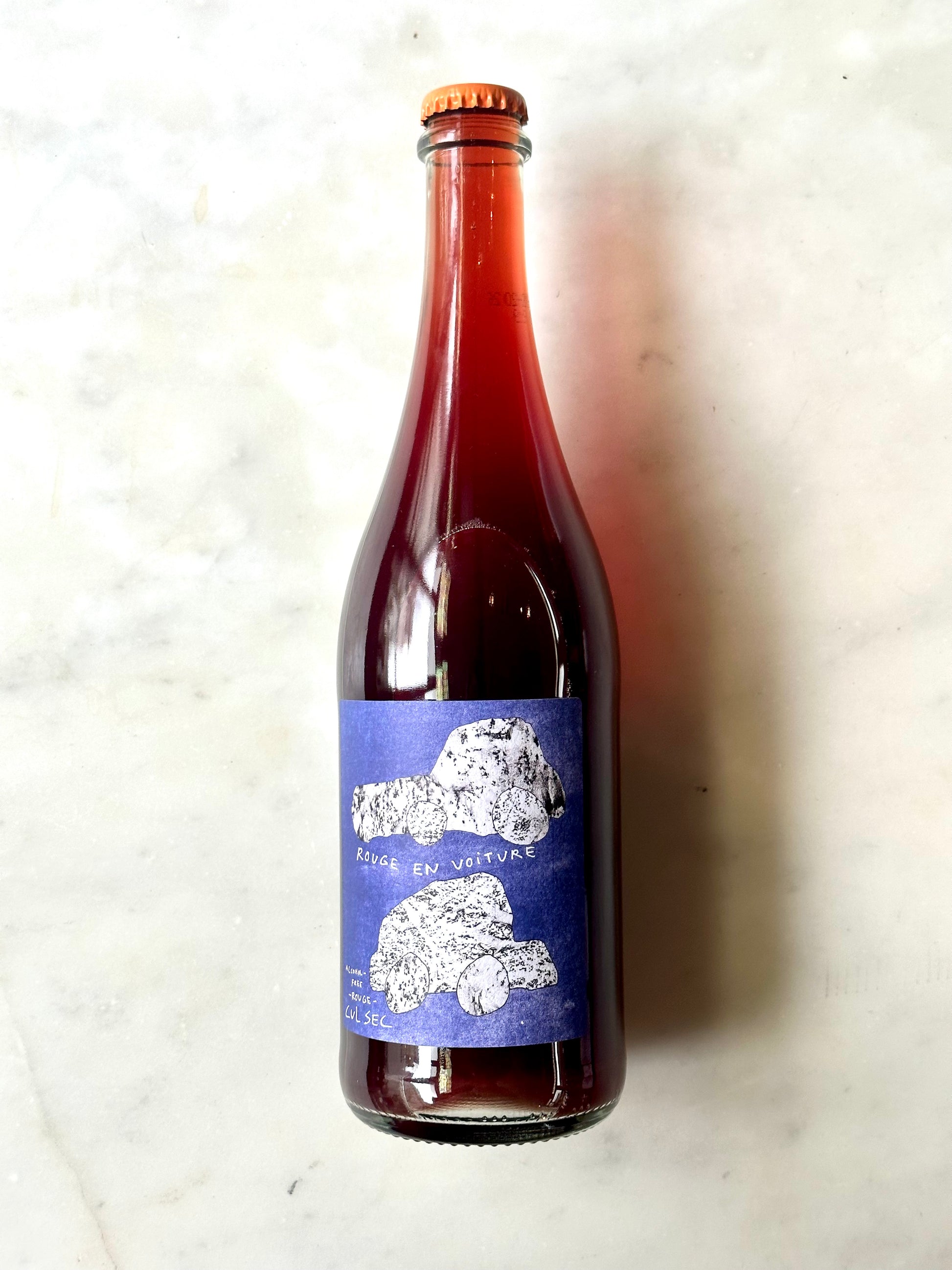 Rouge en Voiture (ROOD): Sappige tannines, vol en droog, met een aromatisch vulkanisch terroir. Levendig rood fruit, hout, met een subtiele bruis. Geproduceerd uit biologische wijndruiven, rabarber en rode bes op eik en kombucha. Aroma’s van bramenblad, hibiscus en cacao.