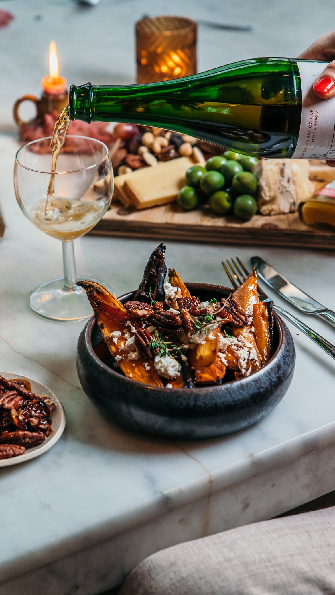 Geroosterde pompoen en zoete aardappel met pecannoten, maple, cranberry’s en gekarameliseerd uitje