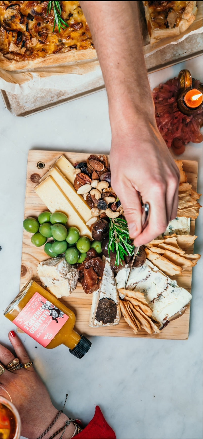 Een uitbundige kaasplank met onder andere de beroemde truffelbrie en magor di noce van L’Amuse. Een borrelplank met 5 soorten kazen, olijven, nootjes, toast en steelt de show met onze verrassende homemade mosterdfruit chutney.