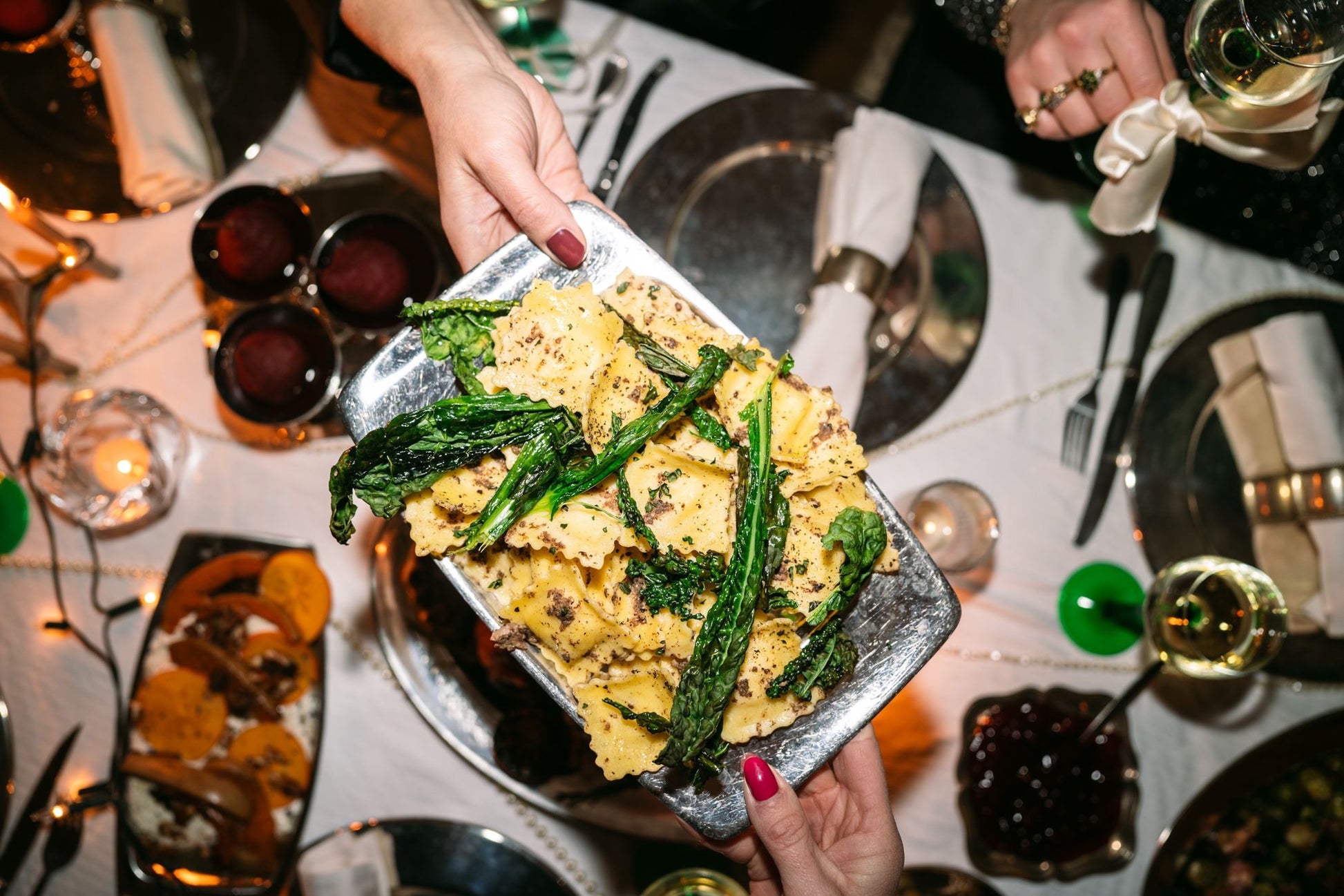 Truffelravioli, cavalo nero, paddenstoeltjes en burrata